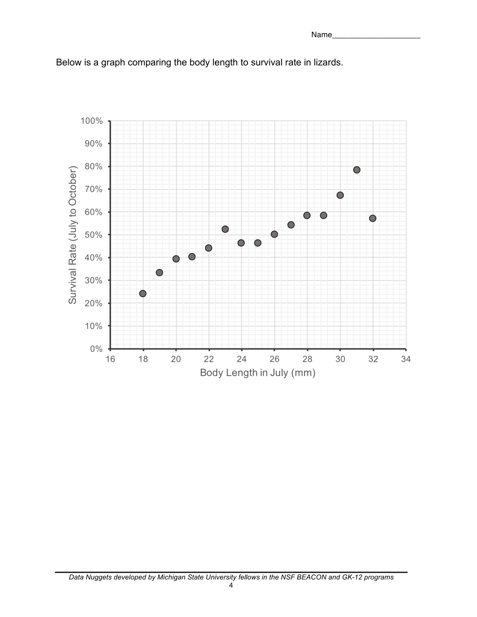 According to the graph, lizards with a body lenght over 26 mm have a survival rate
