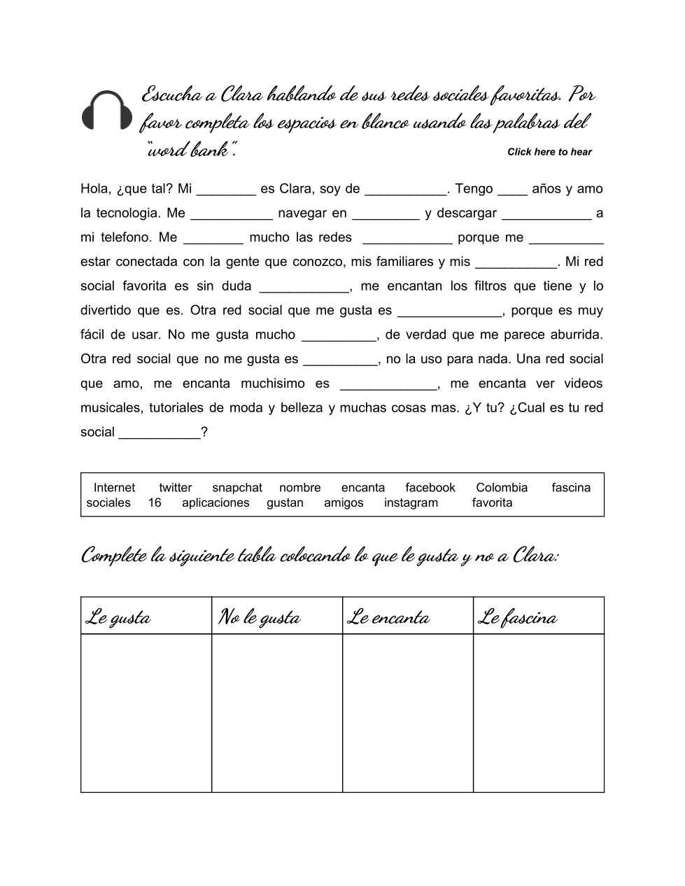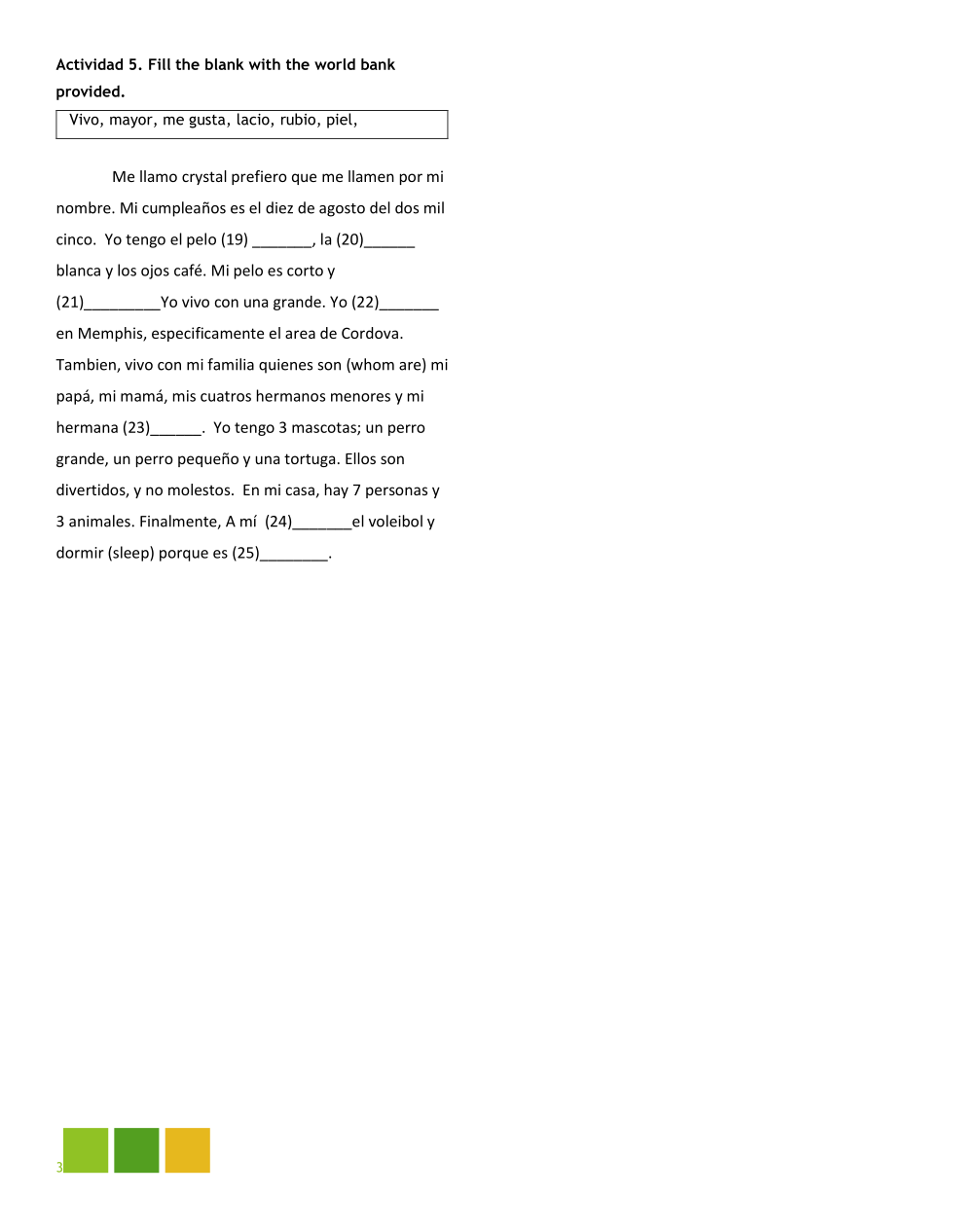 Type the answer to this activity using the word bank provided. (vivo, mayor, me gusta, lacio, rubio, piel, pelo, divertido)