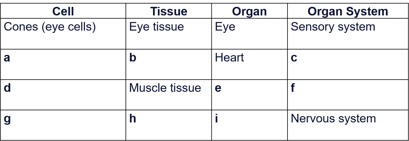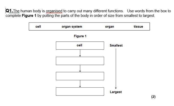 Put the following key terms in order of size from smallest to largest (1): tissue, organ system, organ, cell, organism