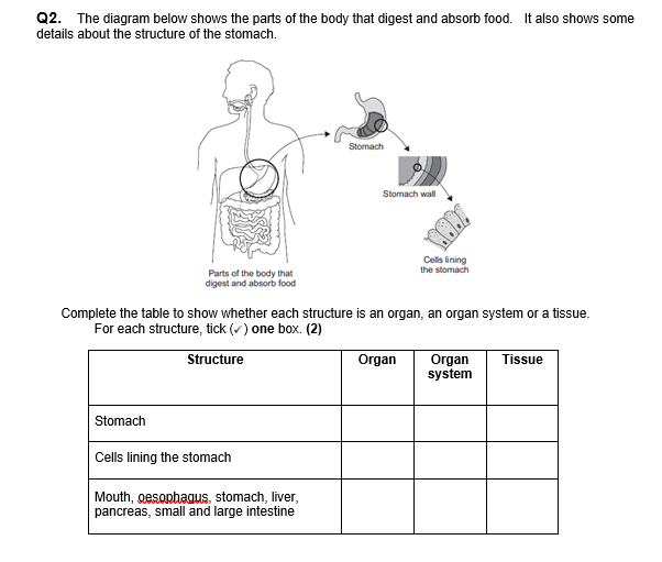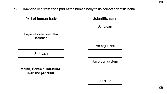Write down each part of the human body and pick from the scientific name list which one should match up with it. e.g layer of cells lining the stomach = a tissue