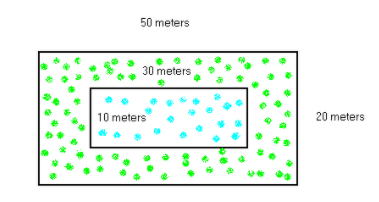 In Tim's house, a rectangular swimming pool (blue) whose length 30 meters and width 10 meters is surrounded by grass (green). The pool with the grassy area makes a large rectangle whose length is 50 meters and width 20 meters. What area is occupied by the grass?