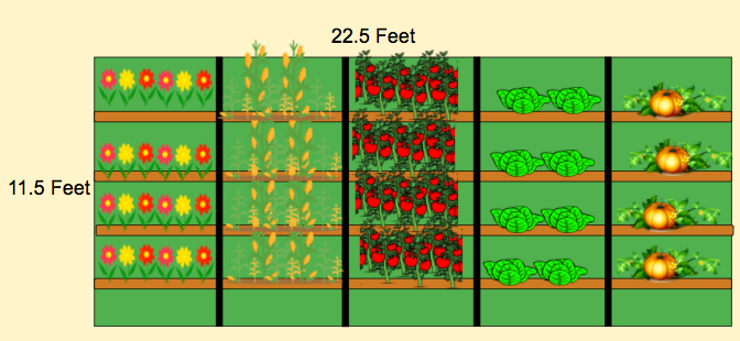 Kai wants to plant a flower & vegetable garden. The dimensions of his garden bed will be 22.5 feet by 11.5 feet. Kai will plant 5 different things in his garden. He wants them each to have an equal amount of space? If he divides his garden into 5 equal sections, what will the area of each section be?