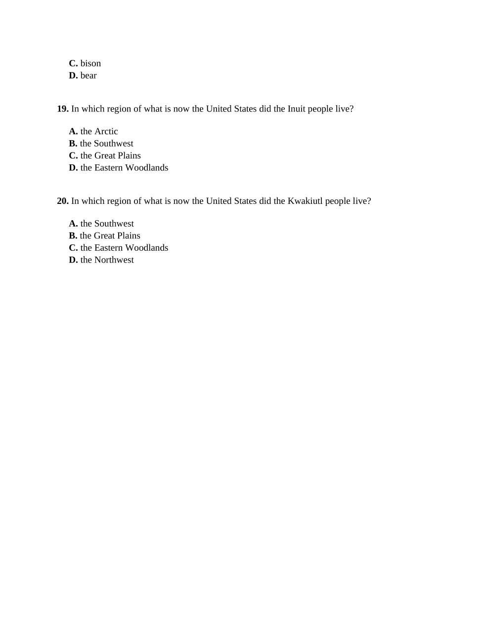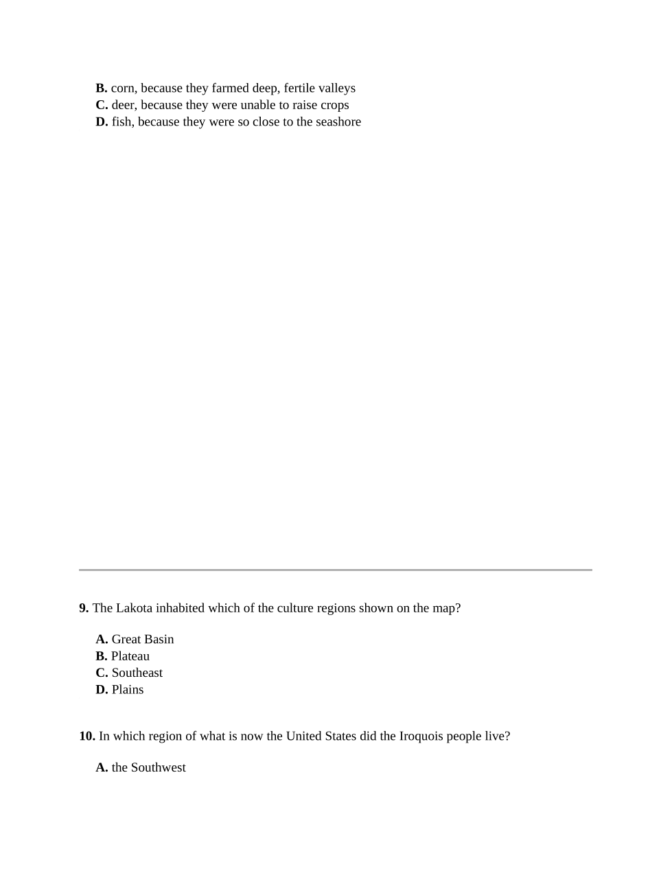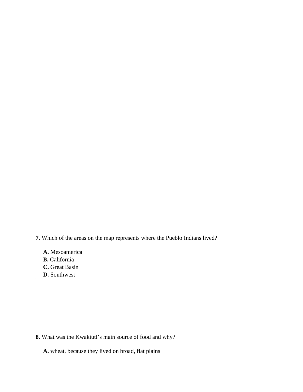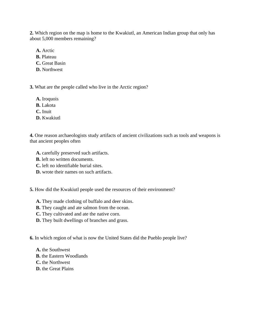 Which region on the map is home to the Kwakiutl, an American Indian group that only has about 5,000 members remaining? Click the letter to see the map.