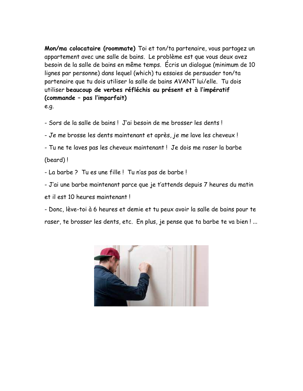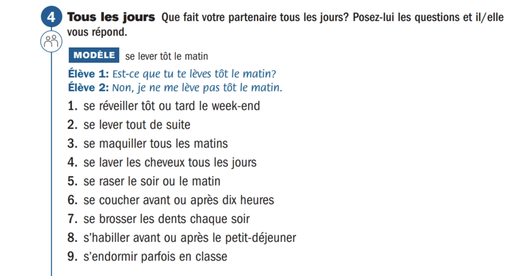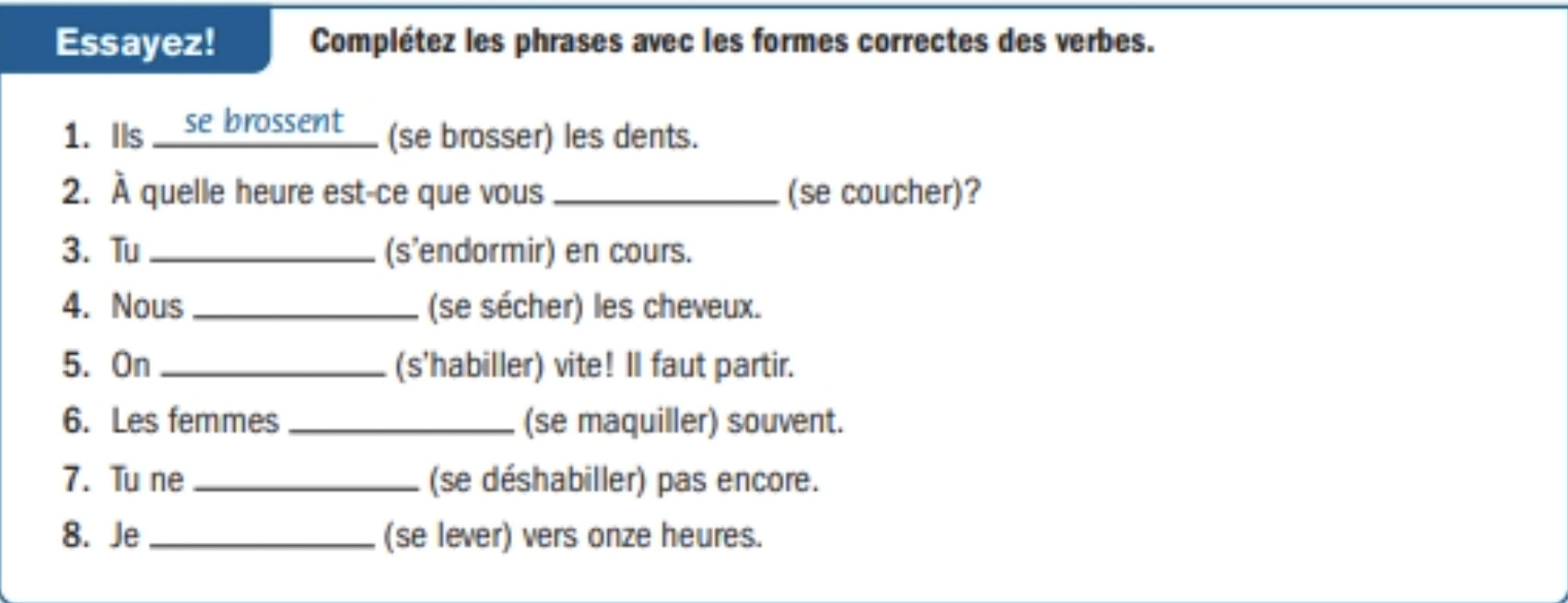 Décris ta routine typique le matin en 5-6 phrases. (N'oublie pas d'employer des expressions temporelles comme d'abord, ensuite, puis, prochainement, après ça, finalement, enfin, mais, en même temps [at the same time] etc.)
