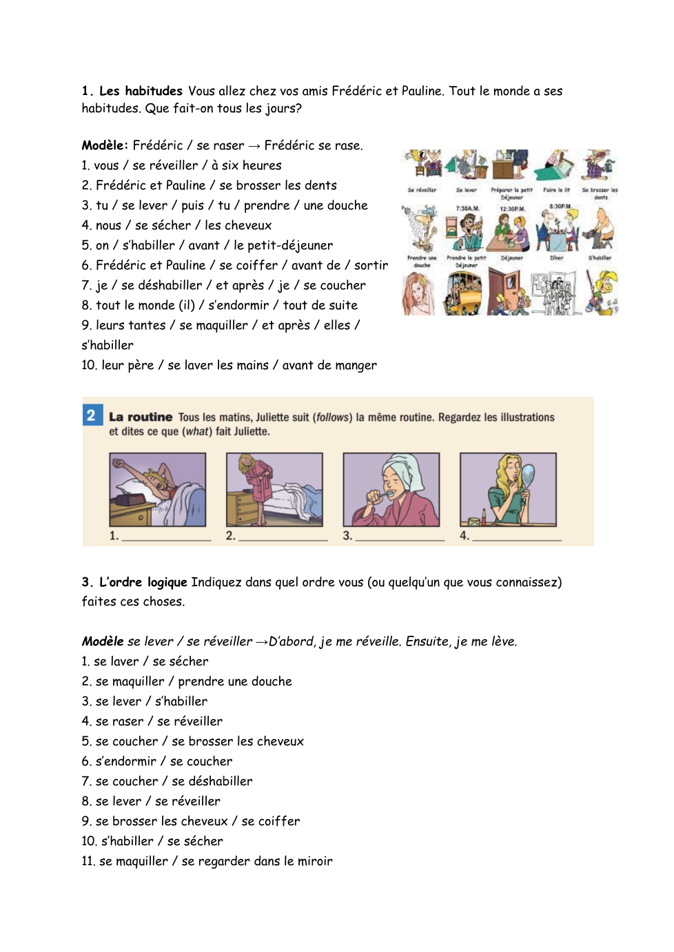 e.g. D'abord, je me réveille à 6h. Ensuite, je me lève à 6h15. Ensuite, je mange le petit-déjeuner. Après ça, je vais à l'école.... Finalement...
