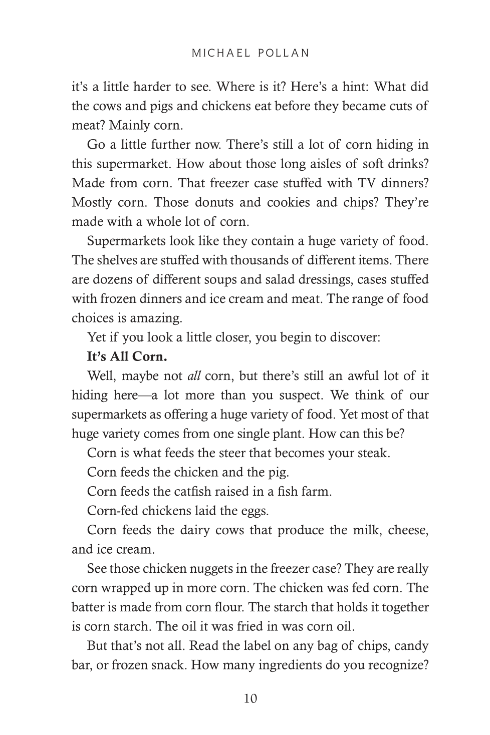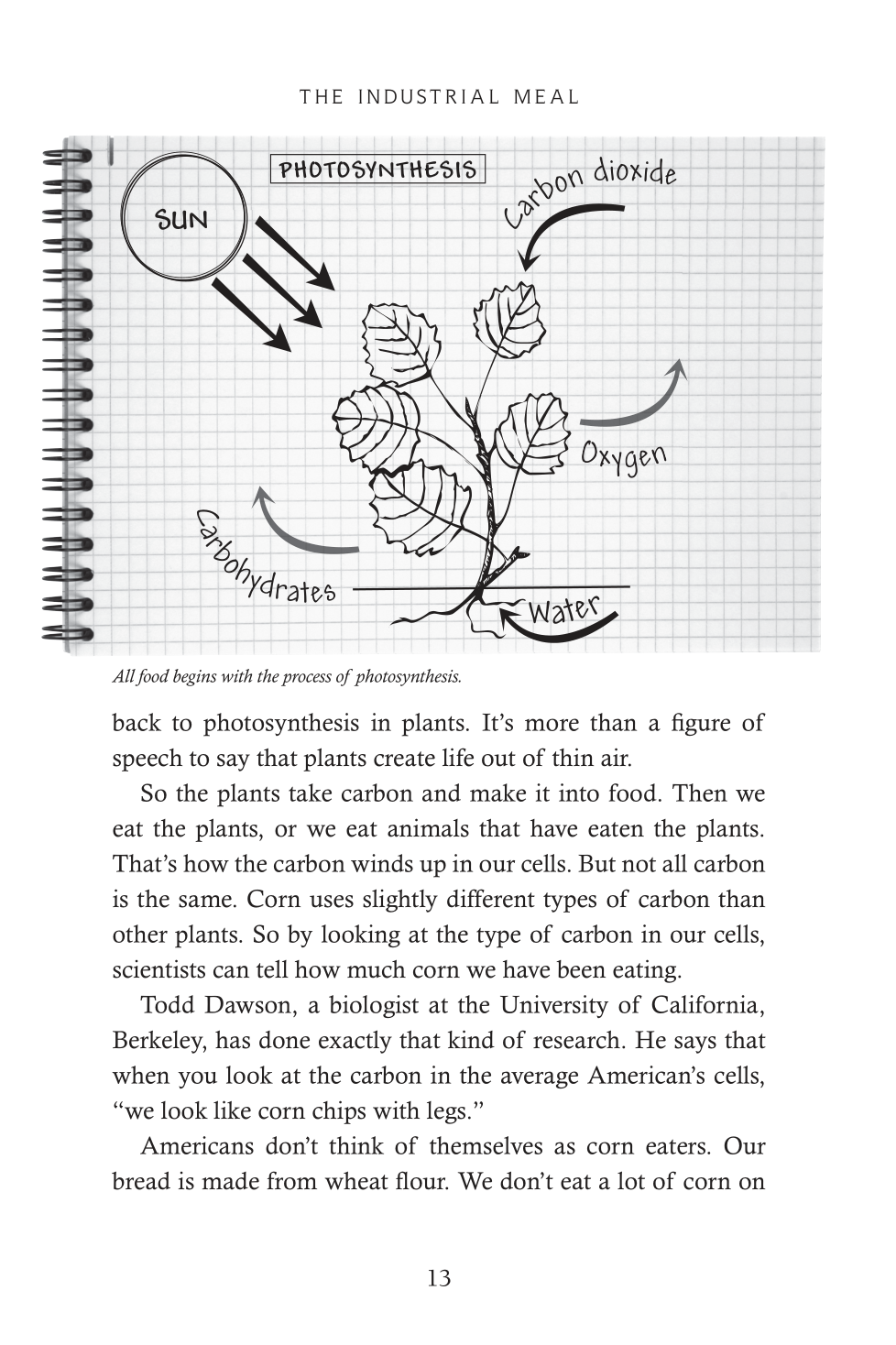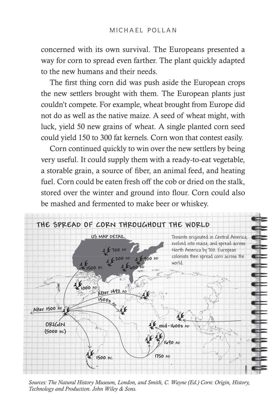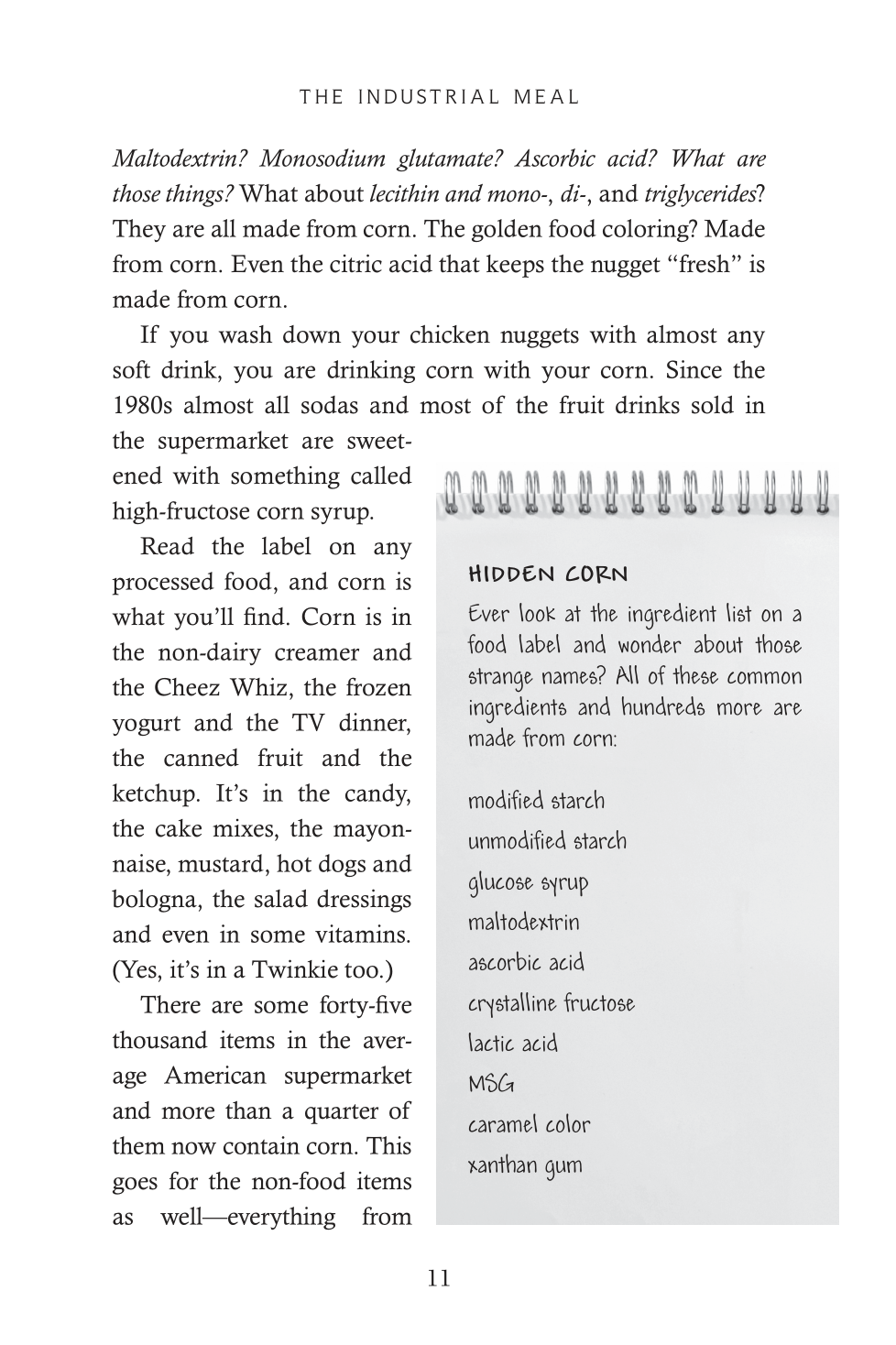 What text feature is illustrated on this page to help the reader understand that corn makes up most of our food.