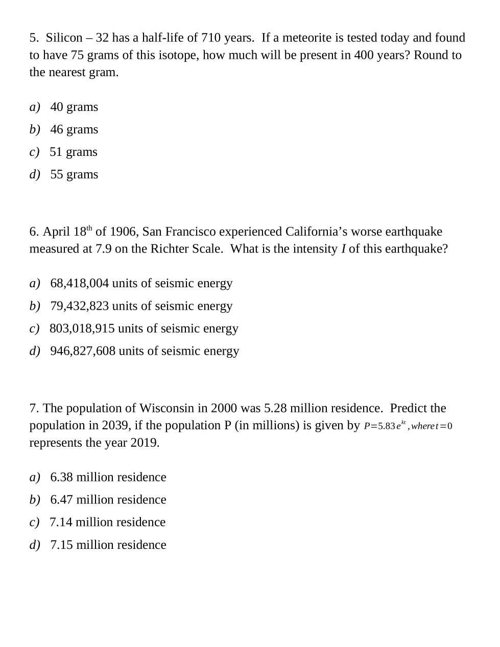 Silicon-32 has a half-life of 710 years. If a meteorite is tested today and found to have 75 grams of this isotope, how much will be present in 400 years?
