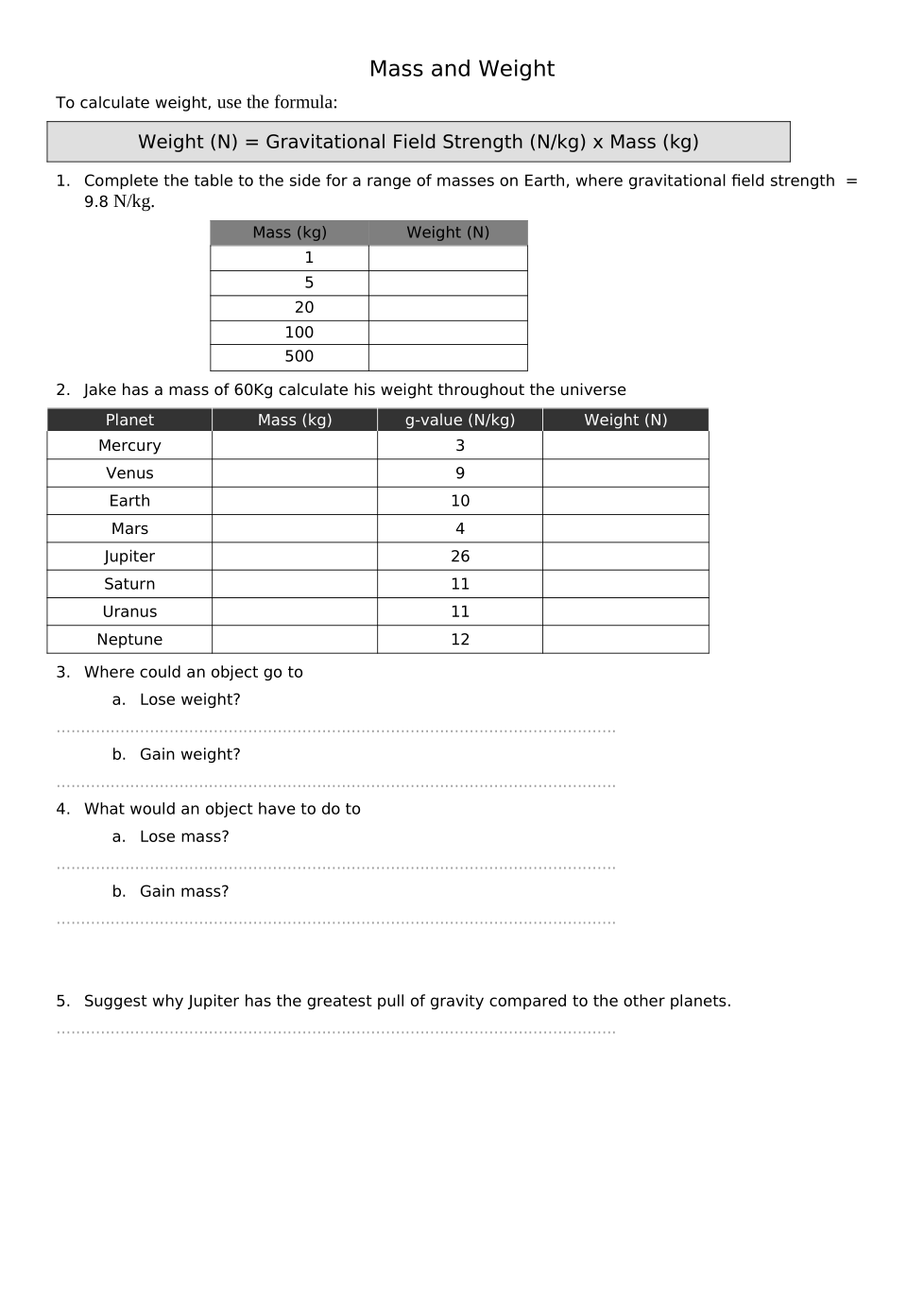Gravity, Mass & Weight - Sustained Practice