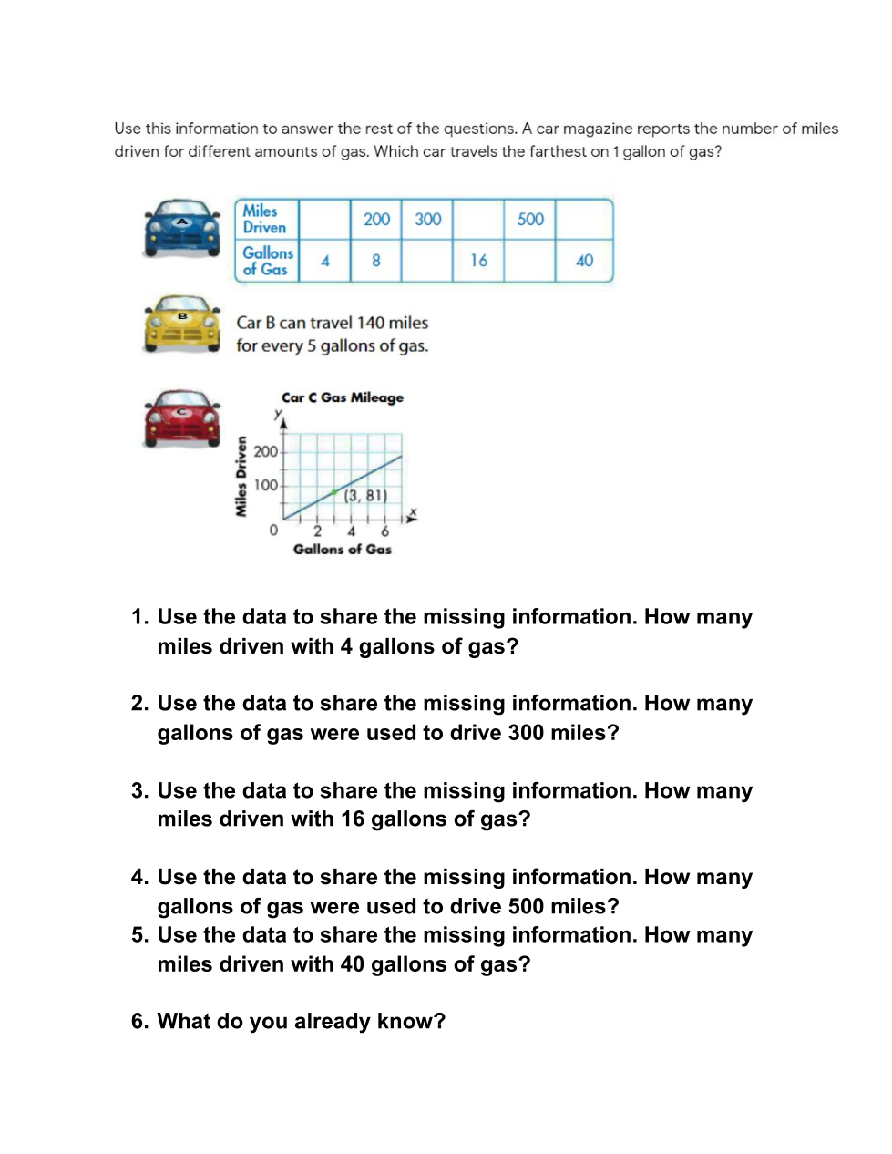 Car C | arrow_right_alt | For every 5 gallons of gas, this car travels 140 miles. |
