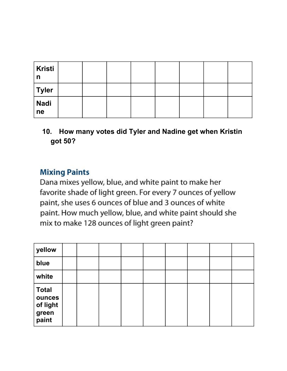 You will have to show your work on #14 for questions 11-13. How much yellow, blue, and white paint should she mix to make 128 ounces of light green paint? How much yellow? only numbers