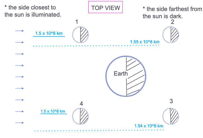In the top-view, as the moon orbits the Earth, how much of the moon is lit and how much is dark?CFS:- Accurately identifies how light impacts the moon’s appearance