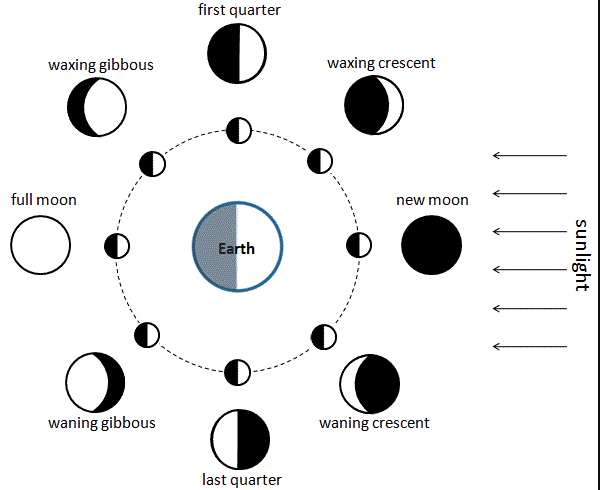 Explain why the moon appears different in each position from Earth? What patterns can you observe to predict the next moon phase?