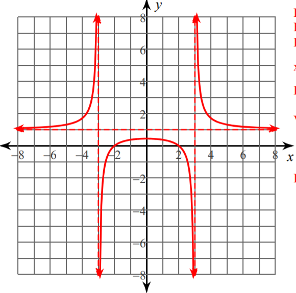 For each function, identify the points of discontinuity, holes, intercepts, horizontal asymptote, vertical asymptote(s) and domain. Then sketch the graph.