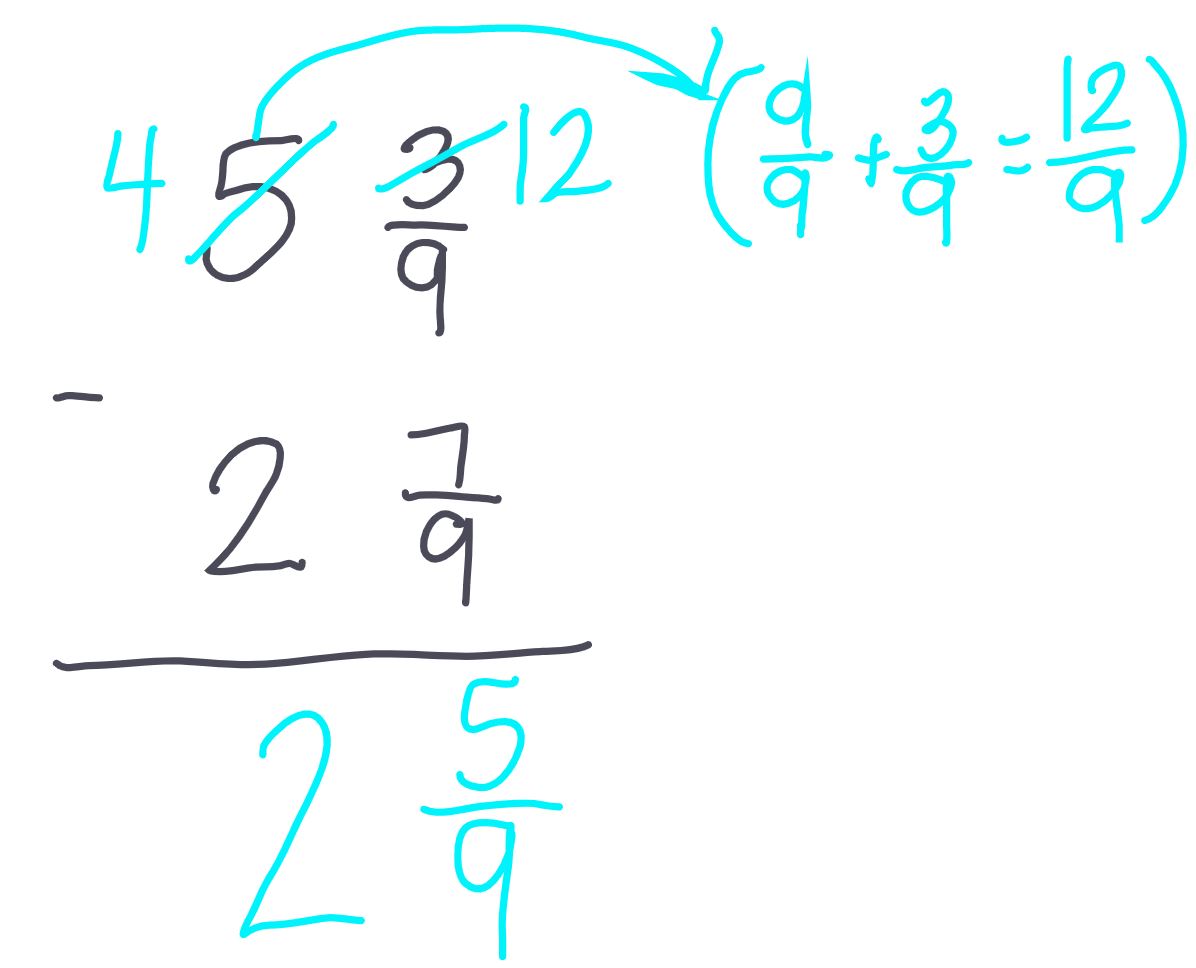 3 1/3 - 1 2/31. Check to see if you can subtract the first fraction from the second; if you cannot then begin step 22. Regroup by changing one of your whole numbers in the first mixed number into a fraction & add it to the fraction you already have (see blue steps with arrow)3. Subtract your numerators, leave your denomators the same, then subtract your whole numbers to find your new mixed number answer