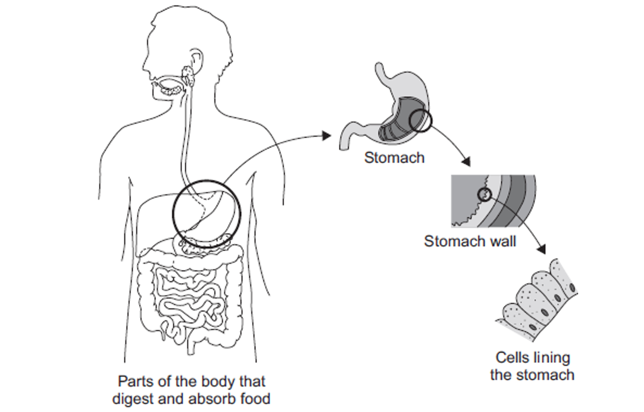 The diagram below shows the parts of the body that digest and absorb food.It also shows some details about the structure of the stomach.