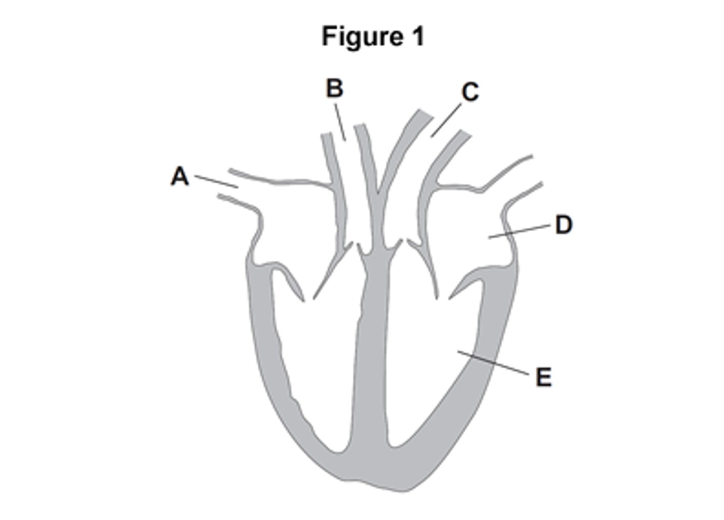 Figure 1shows the human heart. Which blood vessel, A, B or C, takes blood to the lungs?