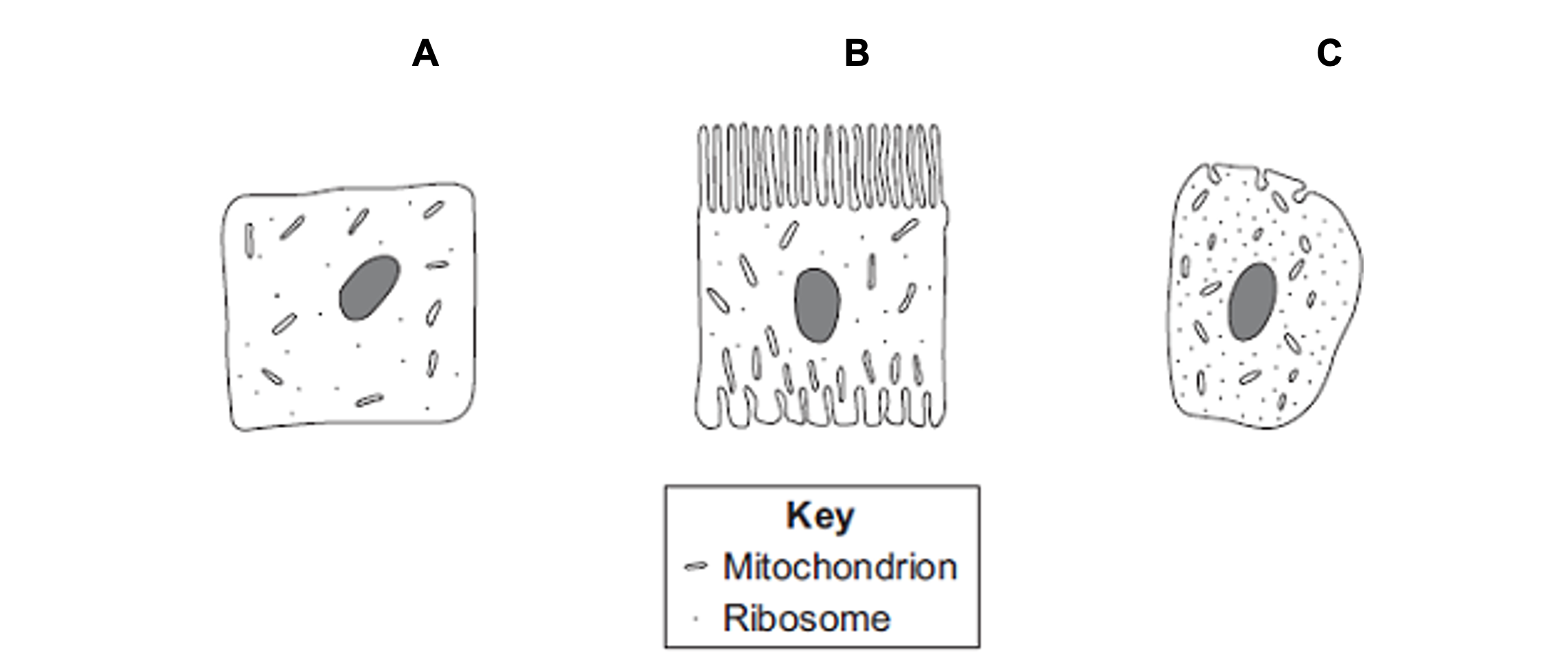 Which cell, A, B or C, appears to be best adapted to increase diffusion into or