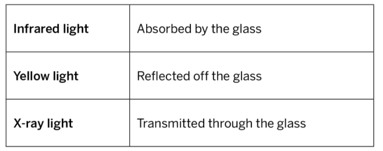 Pedro has a special type of glass that he wants to melt down to make some models. He wonders if light can cause the glass to melt. The table below shows what happens when different types of light hit the glass.
