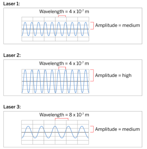 These graphs show the wavelength and amplitude of light coming from three lasers. Could any of these lasers be giving off different types of light?