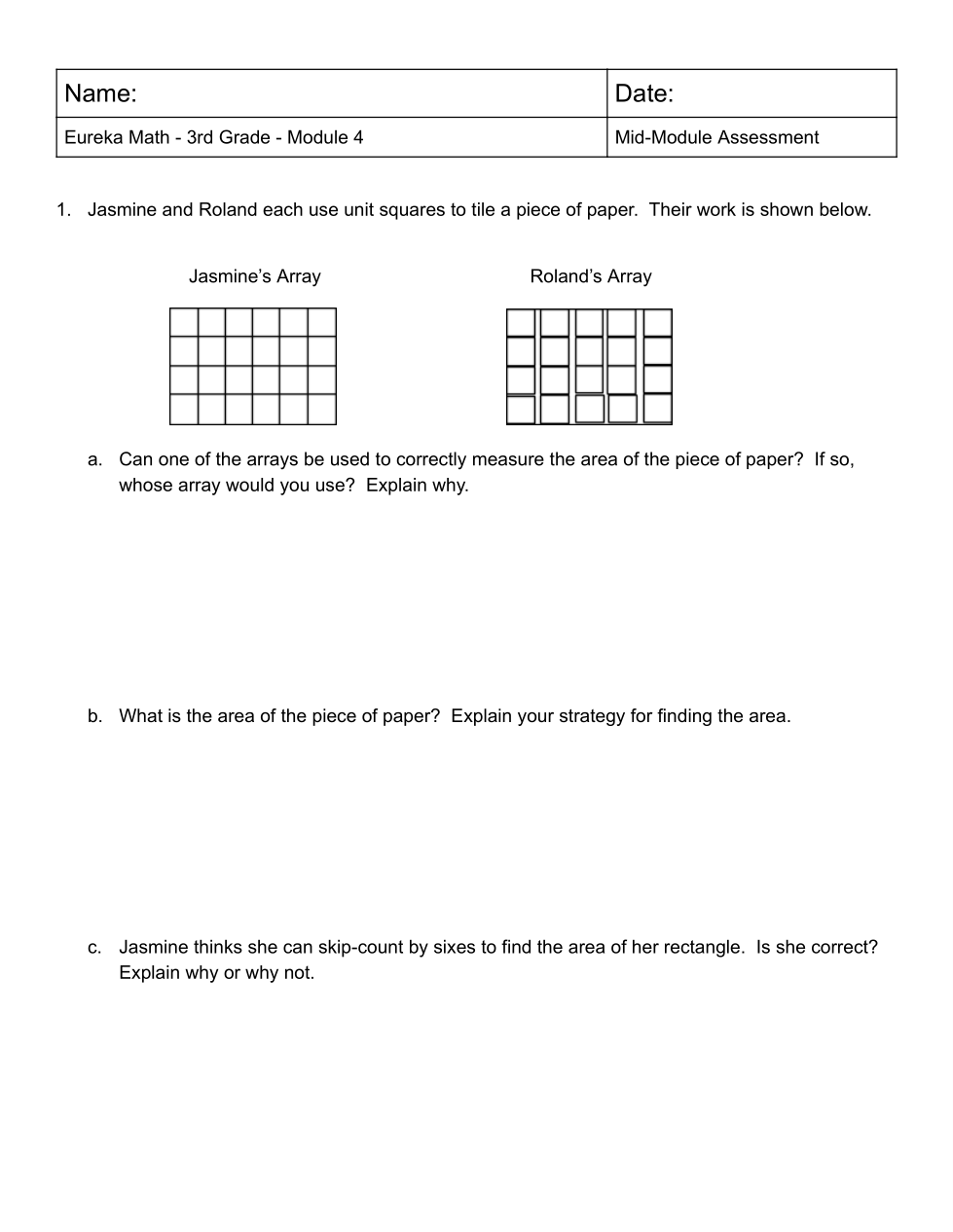 Jasmine and Roland each use unit squares to tile a piece of paper. Their work is shown below. a. Can one of the arrays be used to correctly measure the area of the piece of paper? If so, whose array would you use? Explain why. Create a text box to type out your explanation.