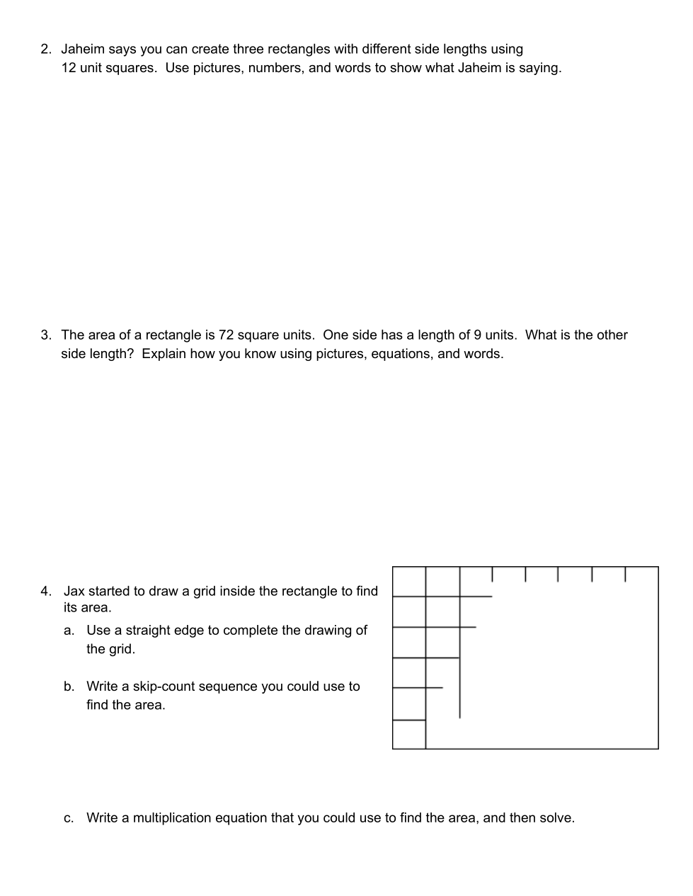 Jaheim says you can create three rectangles with different side lengths using 12 unit squares. Use pictures, numbers, and words to show what Jaheim is saying.