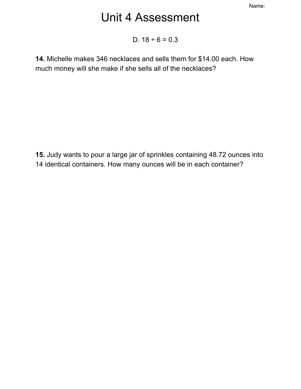Judy wants to pour a large jar of sprinkles containing 48.72 ounces into 14 identical containers. How many ounces will be in each container?