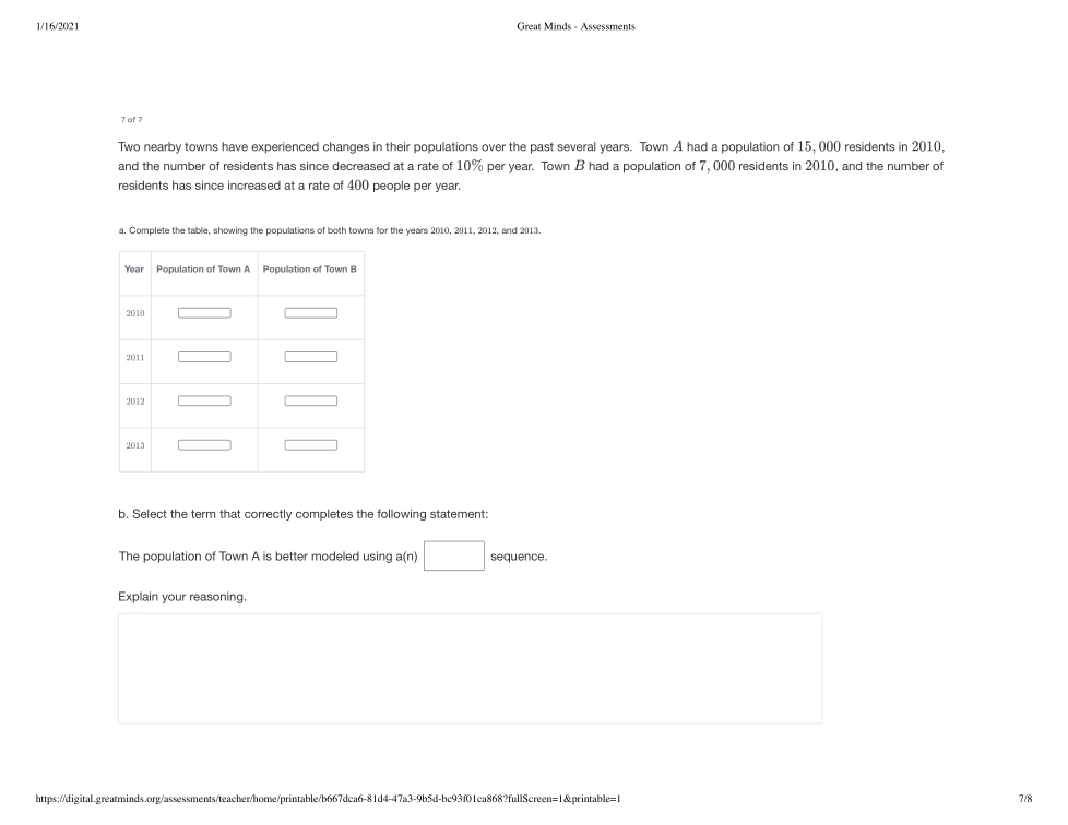 Town A had a population of 15,000 residents in 2010, and the number has since decreased at a rate of 10% per year.
