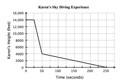 Karen visited the Connecticut Free Fall Club to try sky diving. The actual dive that Karen performed is pictured in the graph below. Karen’s altitude is a function of time. The graph shows her altitude as she flying in the plane, free falling from the sky, opening her parachute and descending slowly to the ground. Free falling is when a person is falling from the sky towards the ground where only gravity is affecting their motion.