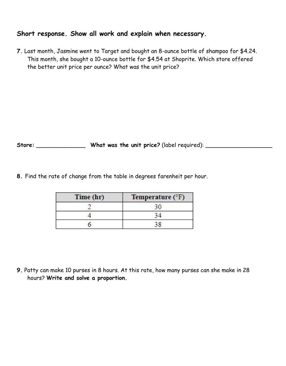 At this rate, how may purses can she make in 28 hours? Include a label in your answer. *You must show the proportion on your work paper.*