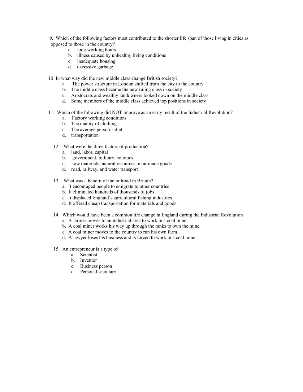 Which of the following did NOT improve as an early result of the Industrial Revolution?