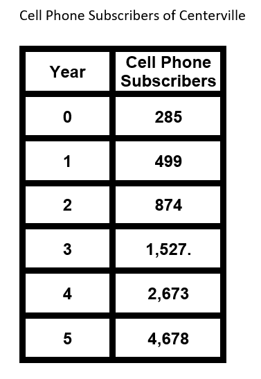 In 1985, there were 285 cell phone subscriptions in the small town of Centerville. Given the following table what is the growth rate?