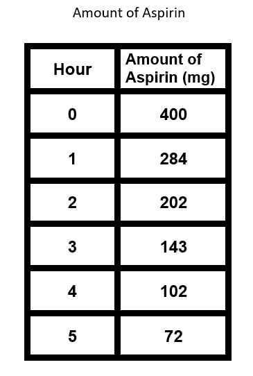 An adult takes 400 mg of aspirin. Each hour the amount of aspirin decreases in the person's system. Given the table below what is the decay rate?