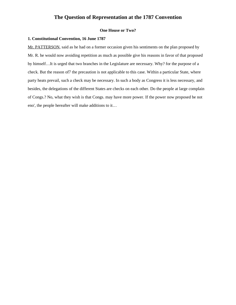 Why was Mr. Patterson either for or against a bicameral legislature? Use evidence from the excerpt to support your answer.