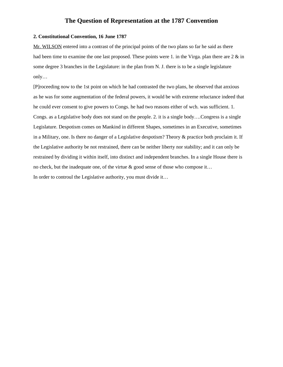 Why was Mr. Wilson either for or against a bicameral legislature? Use evidence from the excerpt to support your answer.