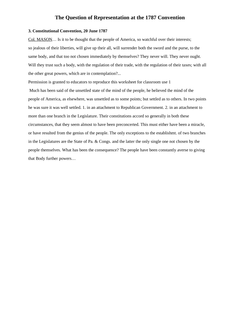 Why was Colonel Mason either for or against a bicameral legislature? Use evidence from the excerpt to support your answer.