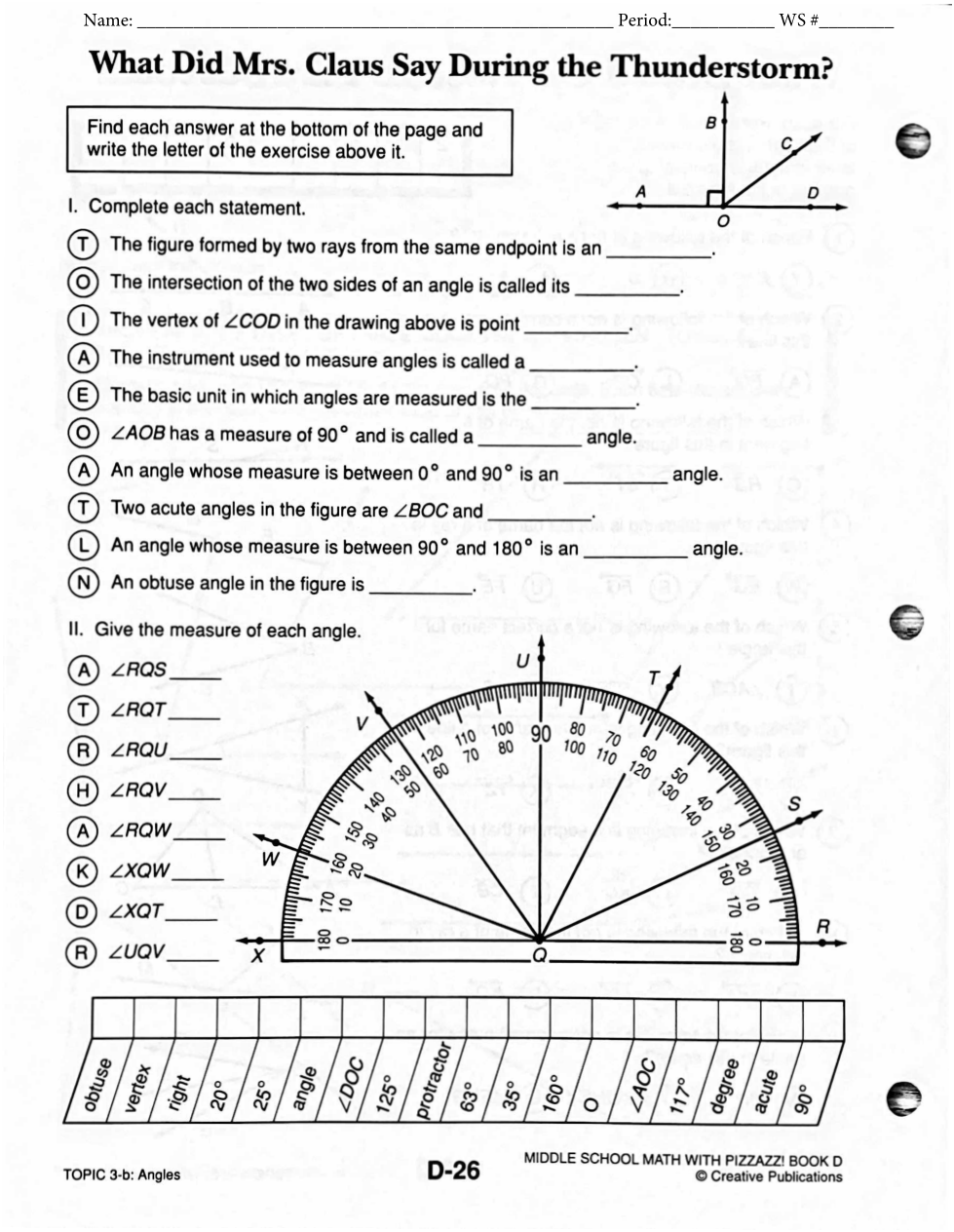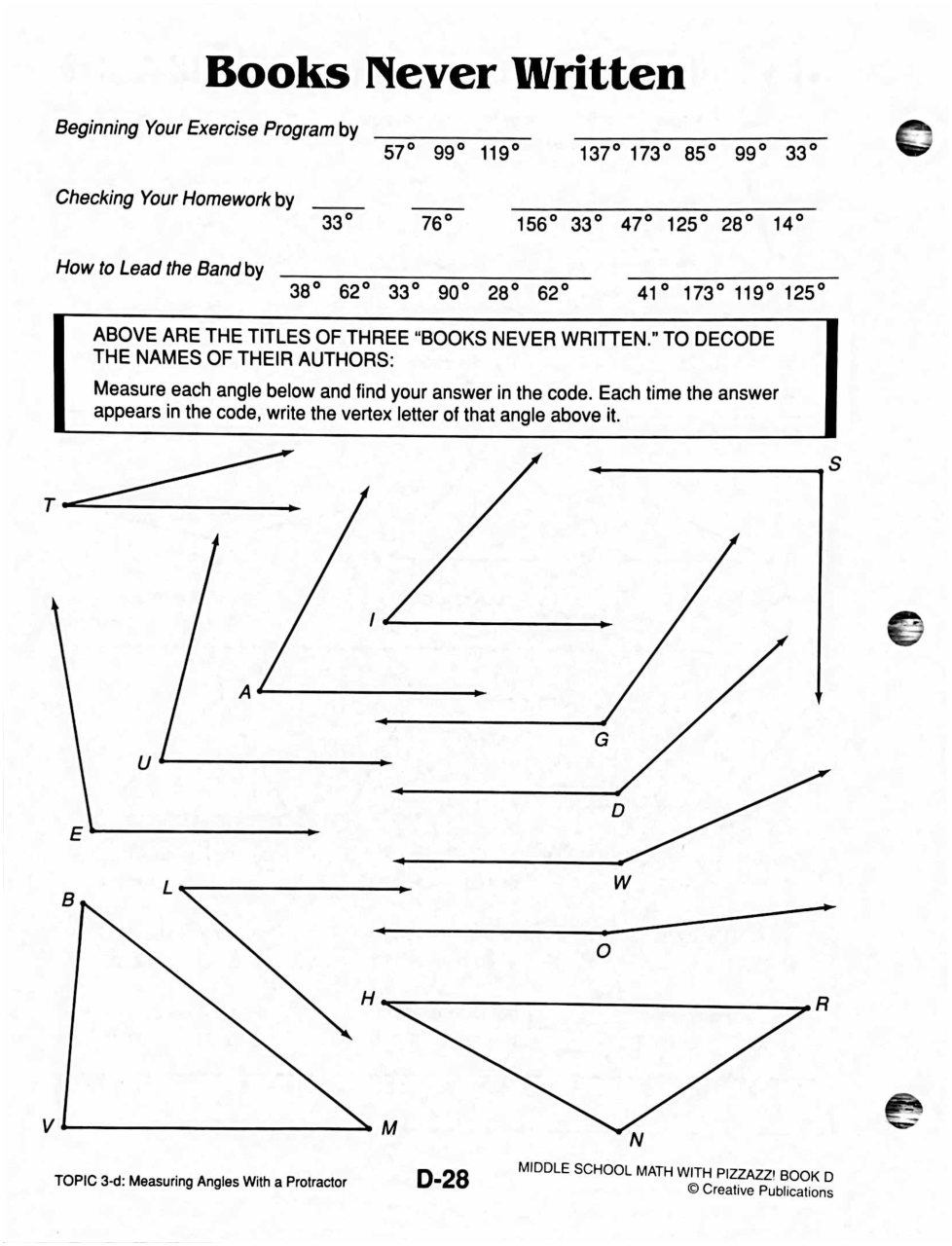Measure each angle and find your answer in the code. Each time the answer appears in the code, write the vertex letter of that angle above it.