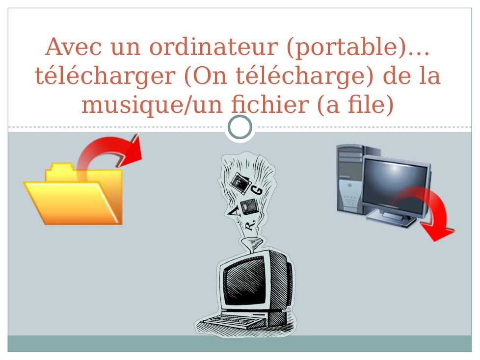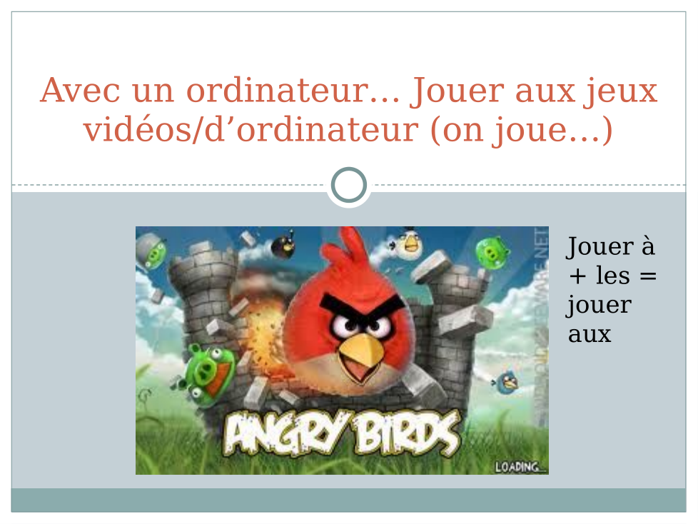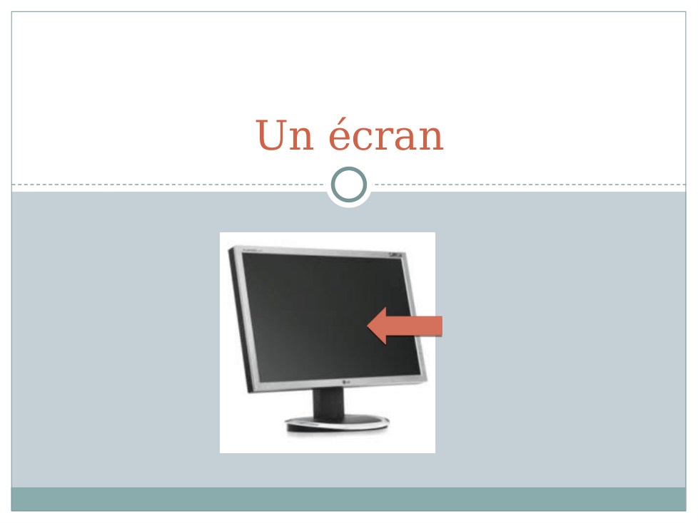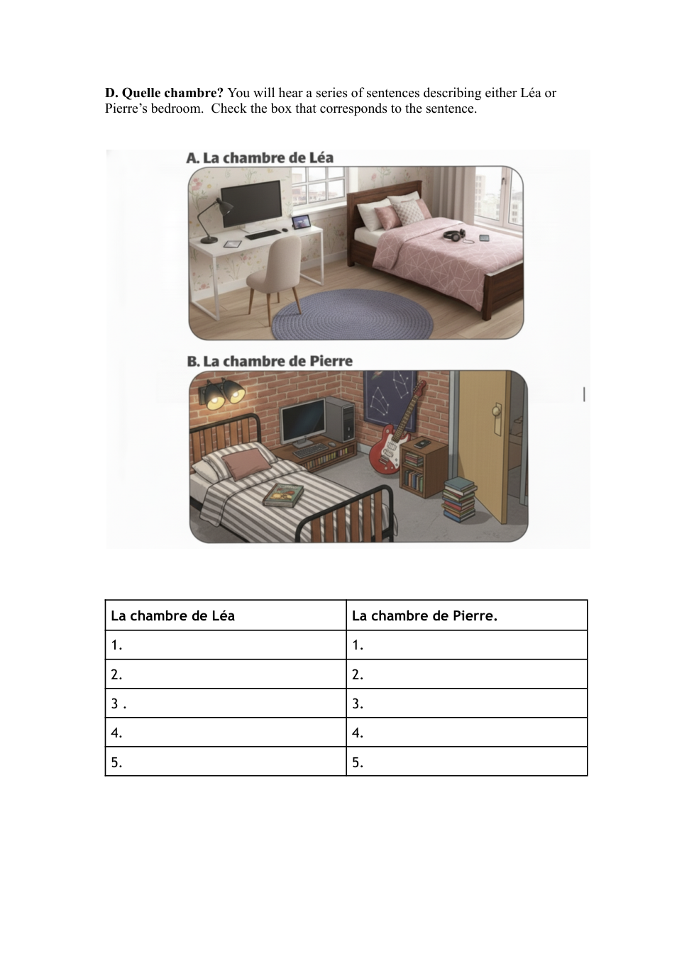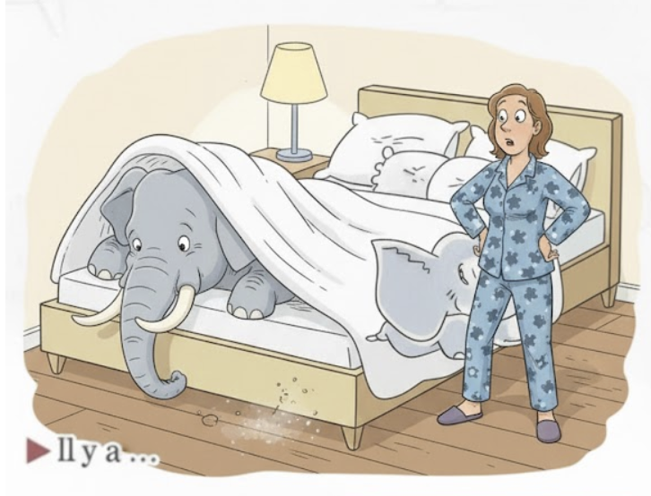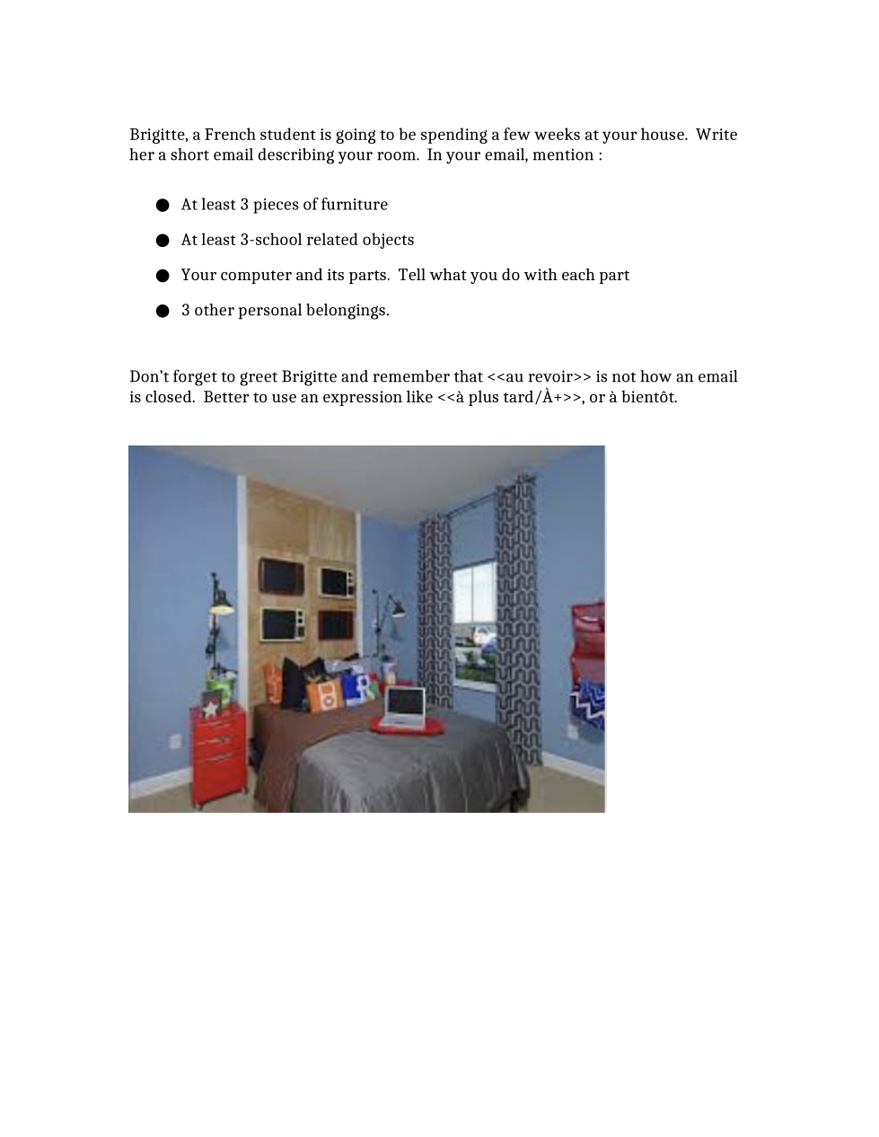 e.g. Dans la salle de classe est Mickey. Il y a un livre sur le bureau. Aussi, l'ordinateur est à gauche de la télé, mais la télé est devant la salle de classe...
