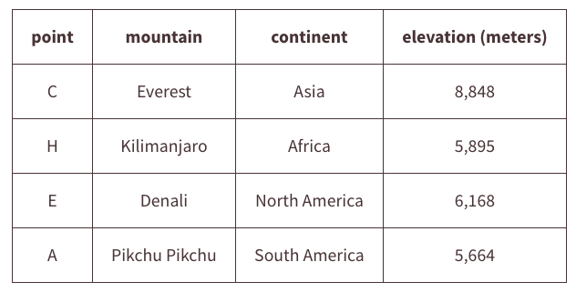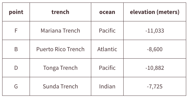 You may use this elevation applet to help you solve the following problems. To use the applet drag the points marking the mountains and trenches to the vertical number line using the information on the tables below.