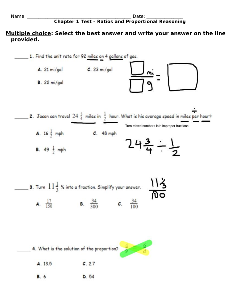 MOD Chapter 1 Test - Ratios and Proportional Reasoning