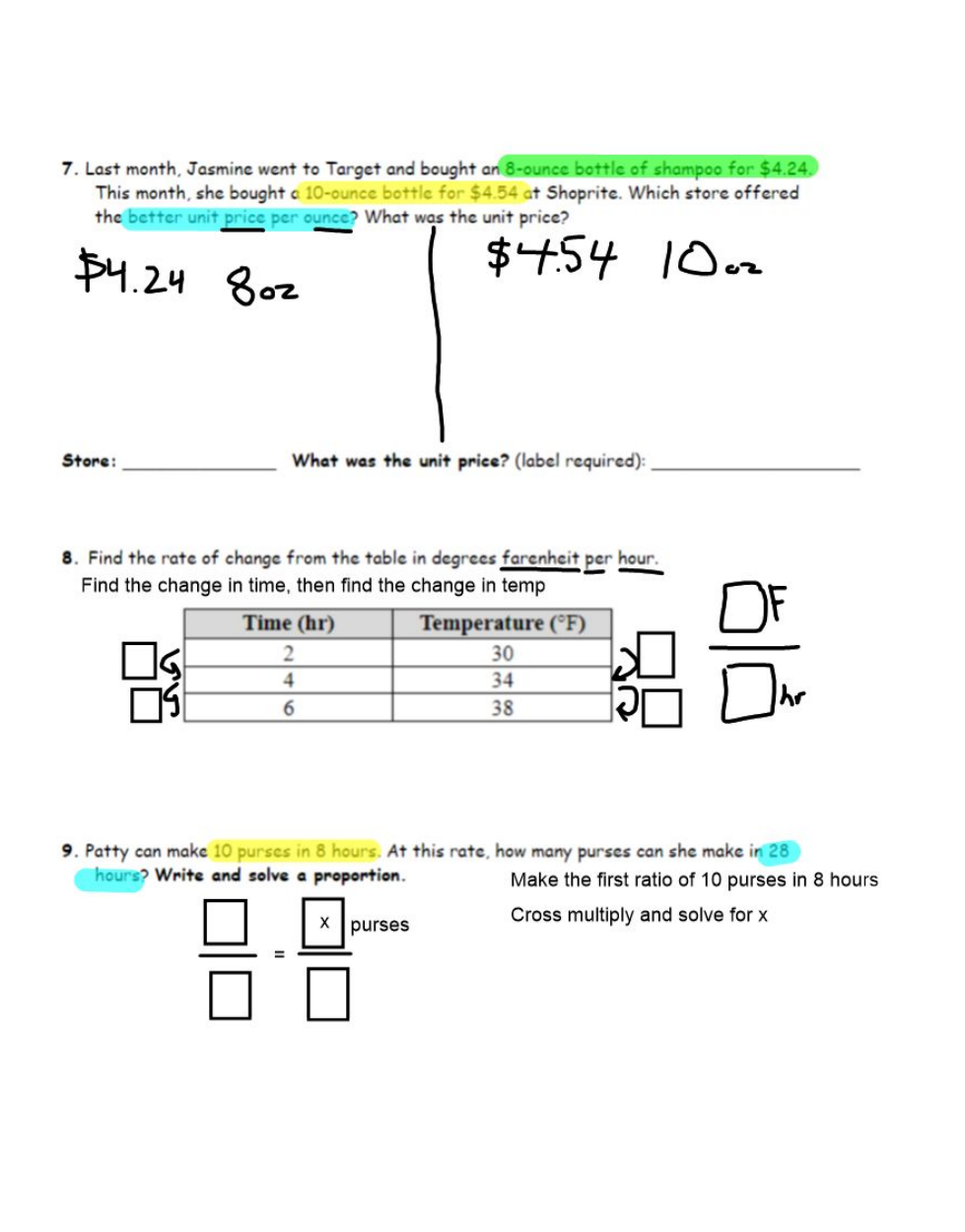 At this rate, how may purses can she make in 28 hours? Include a label in your answer. *You must show the proportion on your work paper.*