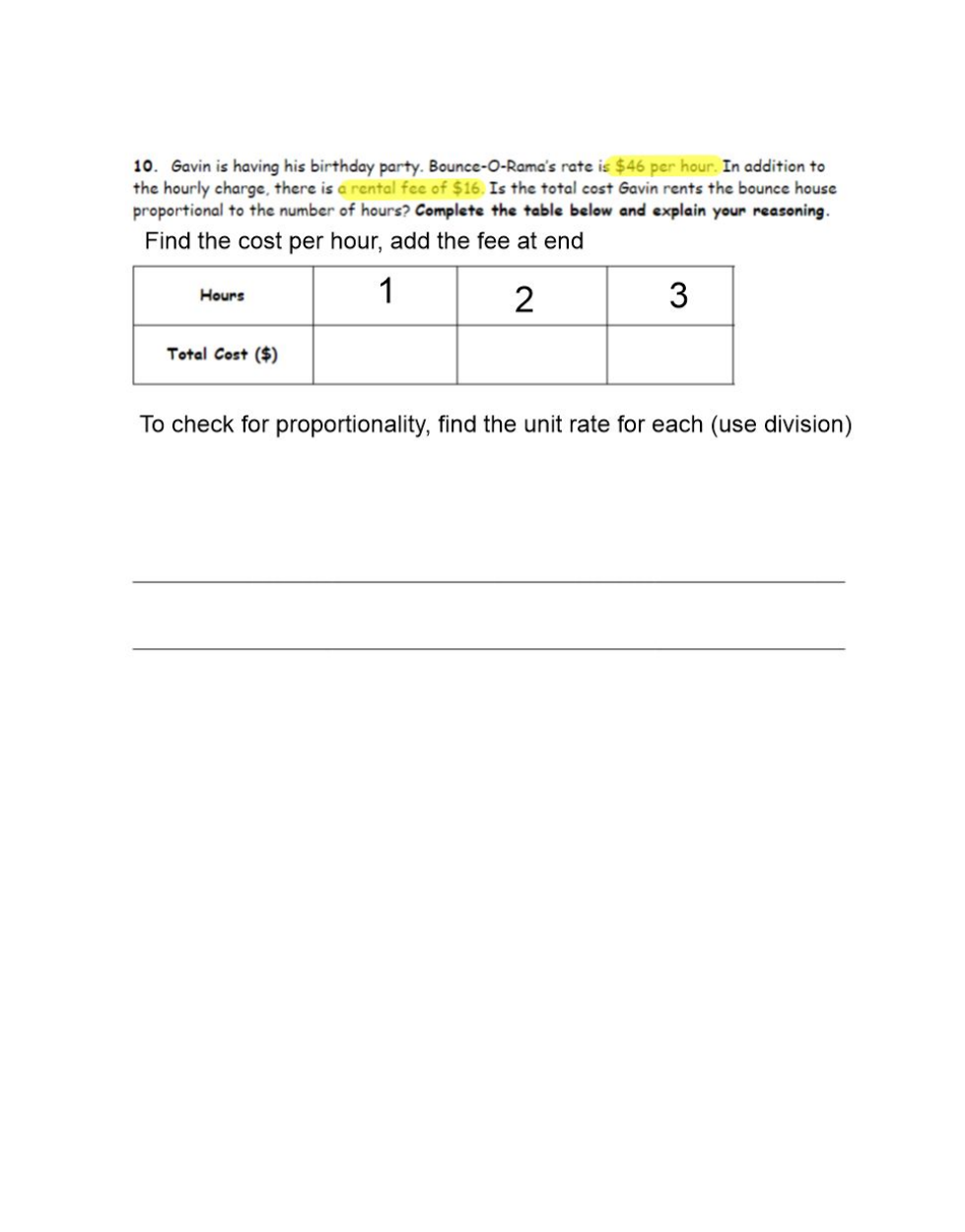 Is the total cost Gavin rents the bounce house proportional to the number of hours? Explain your reasoning. *You must complete the table on your work paper.*
