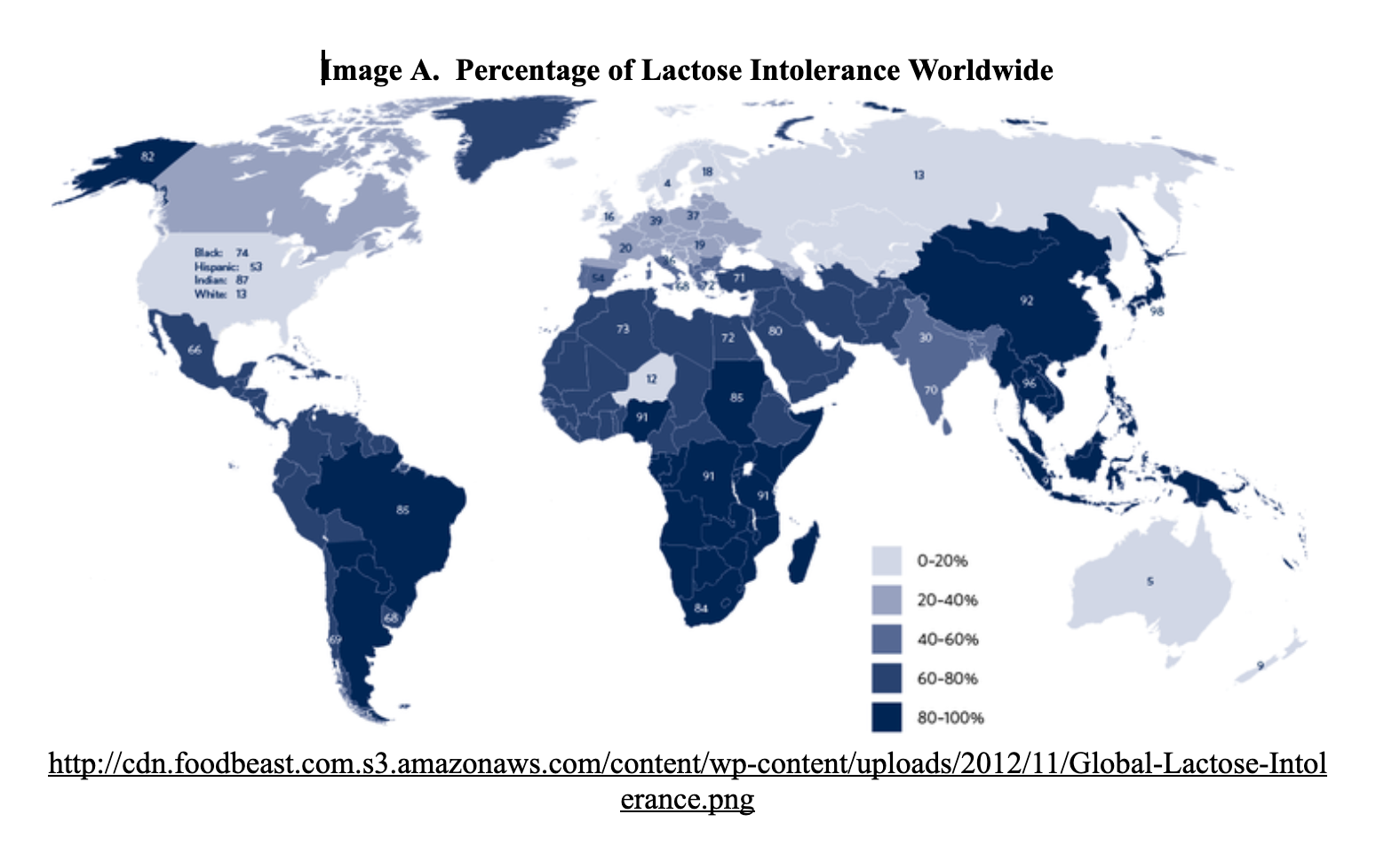 Currently, approximately 75% of the world’s population remains lactose intolerant. The link between cattle domestication and lactose tolerance becomes even more evident when it is broken down by region. Approximately 5% of Northern Europeans, 10% of Americans, 50% of the French/Spanish, and 99% of Chinese people are lactose intolerant. The following map contains average percentages of the human population that is lactose intolerant in countries throughout the world.