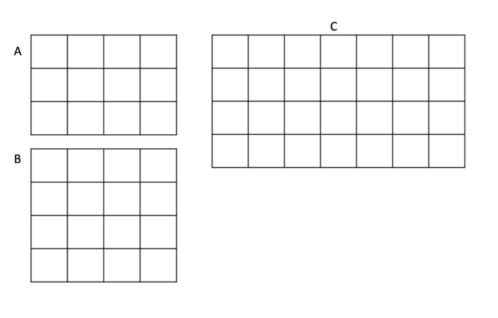 Mark says the two rectangles on the left have the same area as the one on the right. Amy says they do not have the same areas. What is the area 3rd of box C? _____ sq units.