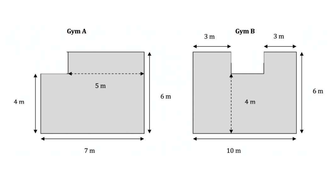 Mr. Kelly is building a new school gym. He is deciding between the two floor plans below. What is the area of gym B? Gym B is _______ square meters.