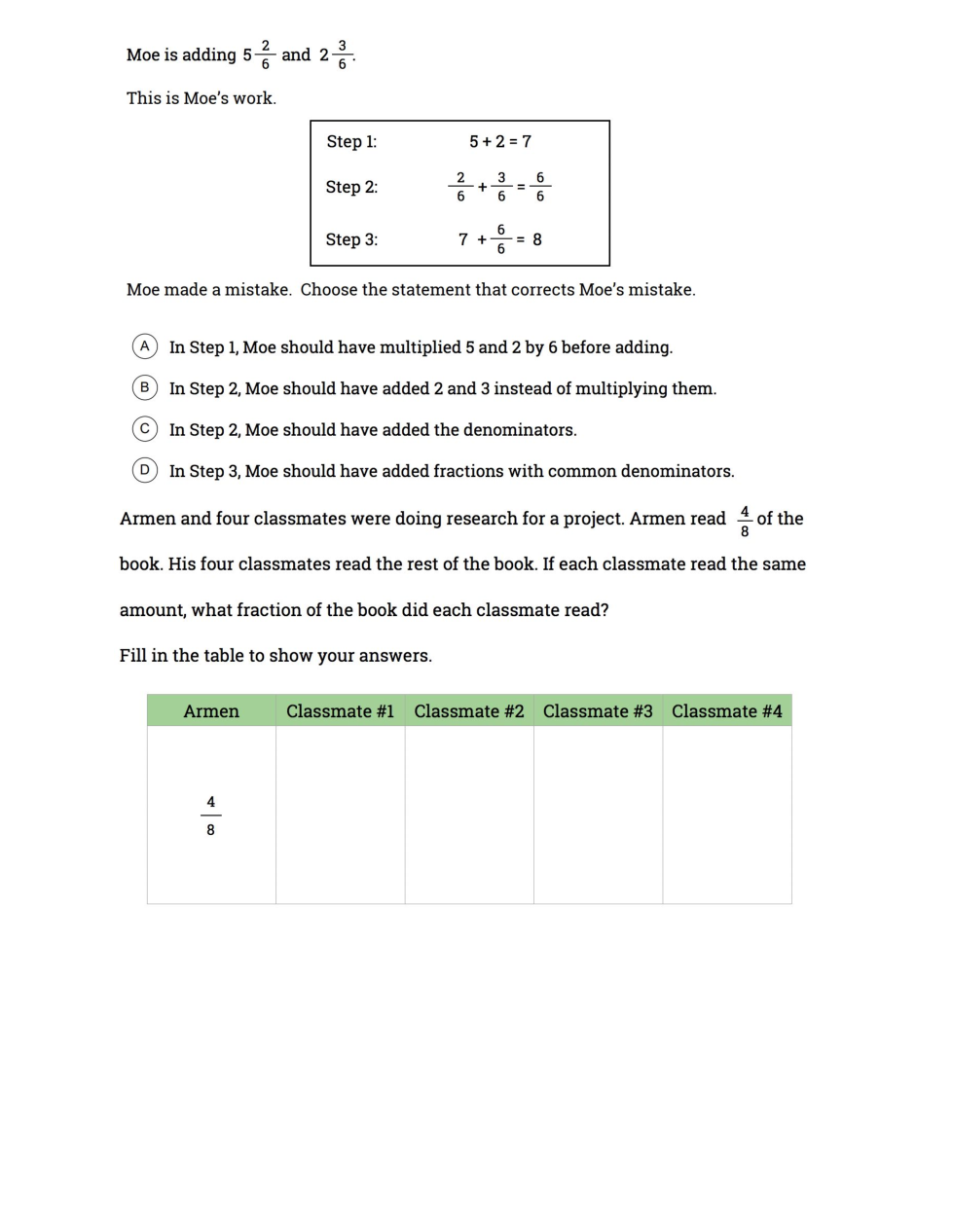 what fraction of the book did each classmate read? Choose your answer and show your work.