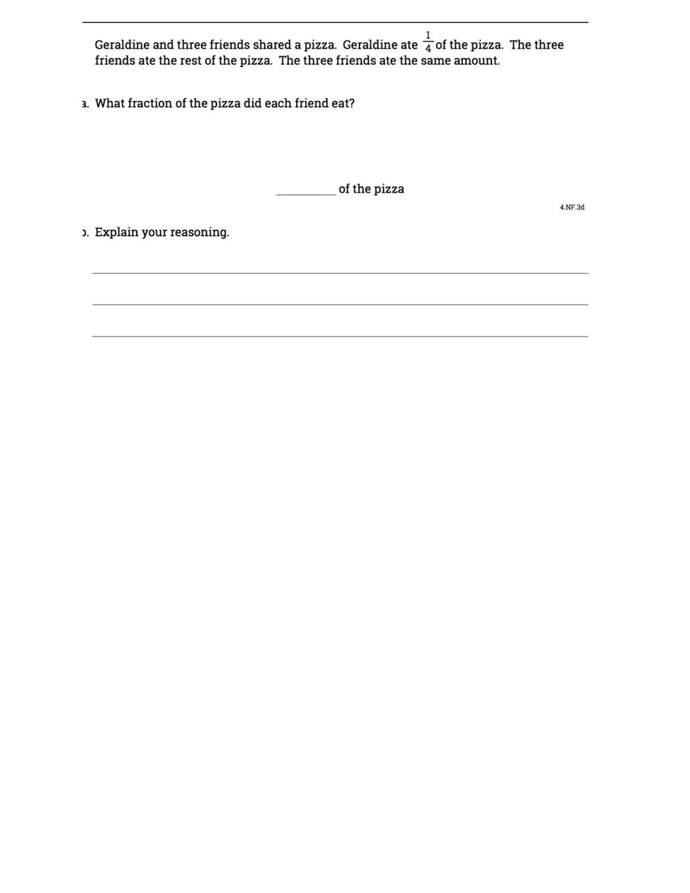 Geraldine and three friends shared a pizza. Geraldine ate 1/4 of the pizza. The three friends ate the rest of the pizza. The three friends ate the same amount.