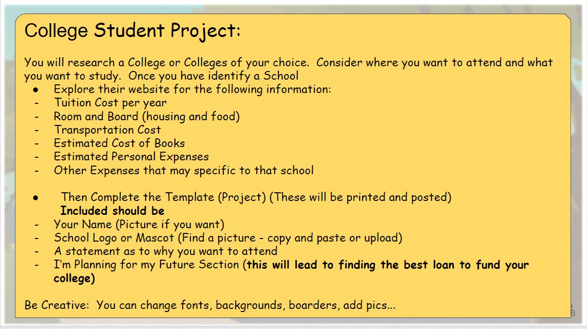 The College Project you will be working on is located in your Google Classroom. There are several templates you can use. Once you are done with your Project, return to your goformative and complete Question #9.