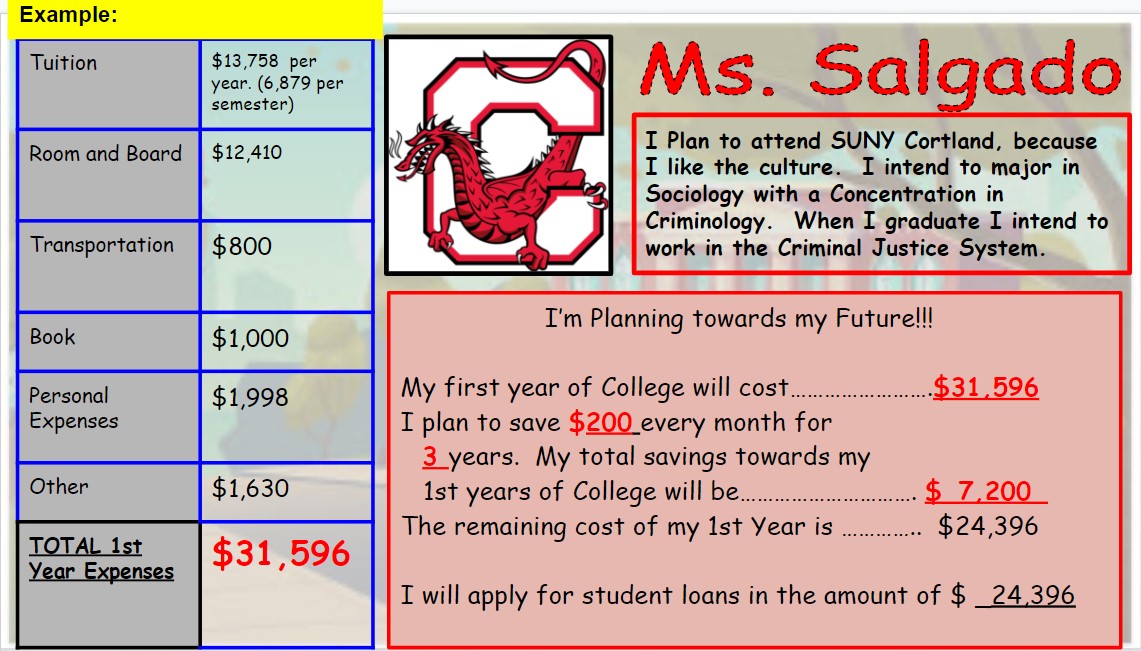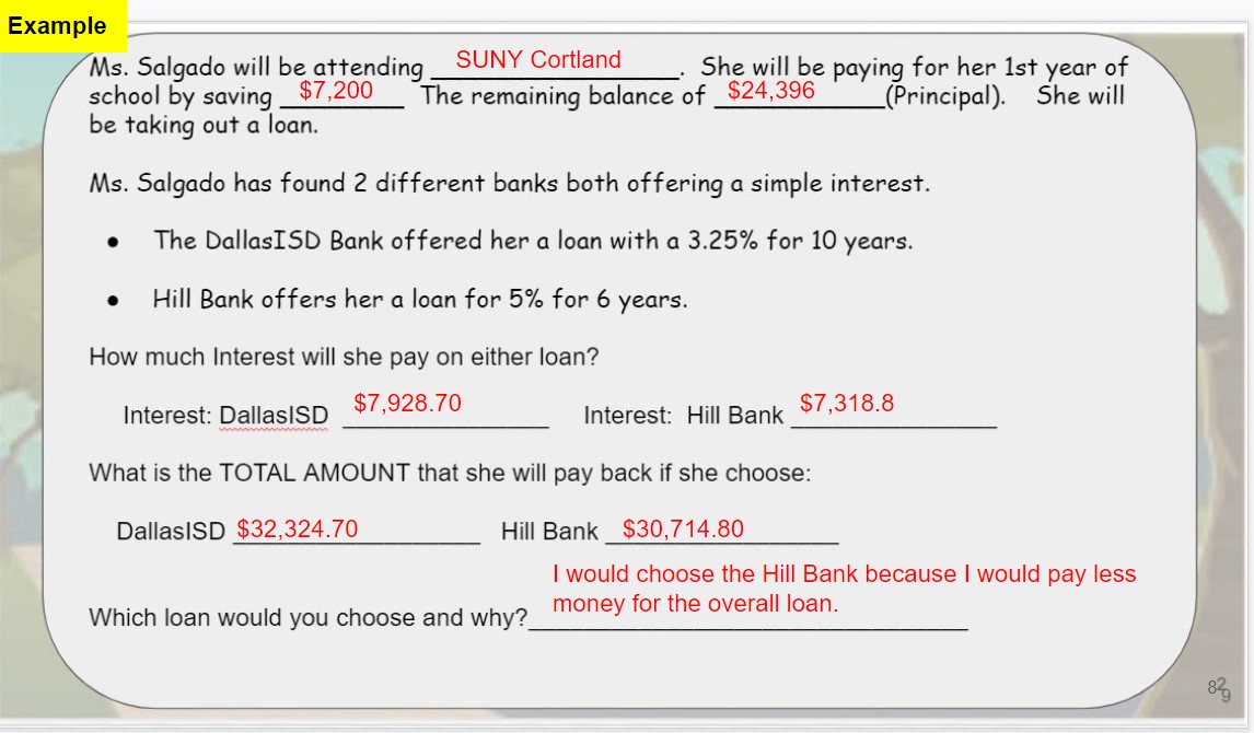 Once you have completed your Project, and I'm Planning towards my Future, you will choose between 2 loan options. Below is an example based on my loan amount. You will click on Show YOUR WORK and Complete based on your indivdual Financial Plan.
