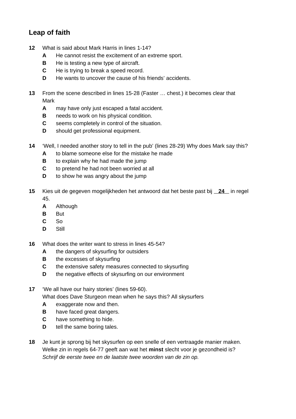 Je kunt je sprong bij het skysurfen op een snelle of een vertraagde manier maken.Welke zin in regels 64-77 geeft aan wat het minst slecht voor je gezondheid is?Schrijf de eerste twee en de laatste twee woorden van de zin op.