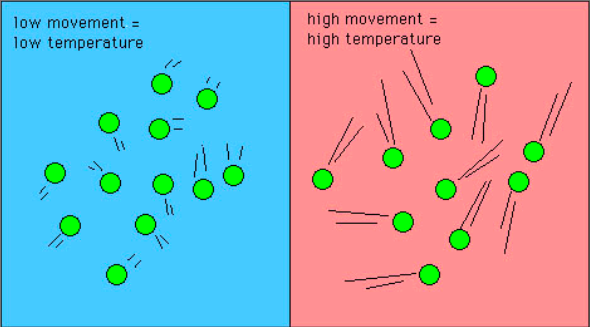 Molecules move and change speed. Temperature is a measure of kinetic energy, which is the energy of the movement of the molecules. Hotter things are made up of faster-moving molecules, which have more kinetic energy. Colder things are made up of slower-moving molecules, which have less kinetic energy. Changes in temperature are the result of molecules changing kinetic energy.